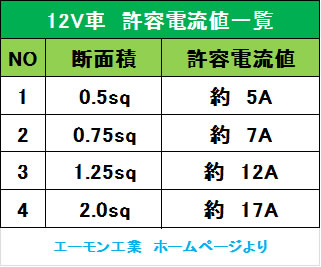 0.5SQ線は60W(5A)以下、できれば30~40W(3.5A)以下が安全な線に対し、最大で90W(7.5A)!!(30w2.5Aオーバー)って。(※全て12Vバッテリーでの計算)