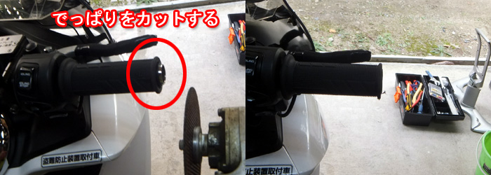 諸事情あり、俺は110mmのグリップを取り付けている(既製品は120mm)。110mmだと少しハンドルが出っ張るので電動斬鉄剣(サンダー)で5mm程カットしてからグリップエンドをつけた。